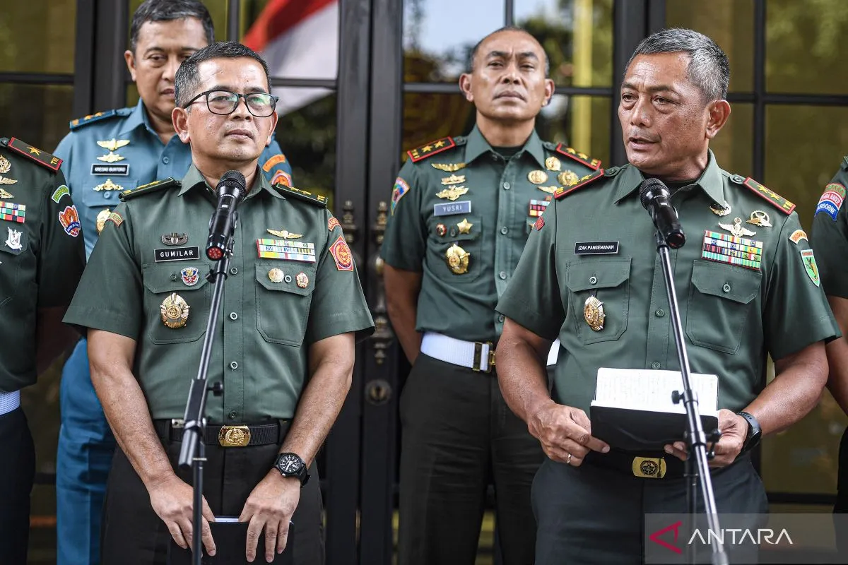 Jakarta (BERITAPOLITIK.ONLINE) — Chief of TNI Public Relations Mayjen TNI Nugraha Gumilar (left) along with Commander of XVII/Cendrawasih Military Region Mayjen TNI Izak Pangemanan (right) provide a press statement regarding the torture video committed by personnel of TNI Yonif 300 Raider/Bjw against suspected member of Papua’s KKB, Definus Kogoya, at Subden Denma Mabes TNI, Jakarta, Monday (25/03/2024).